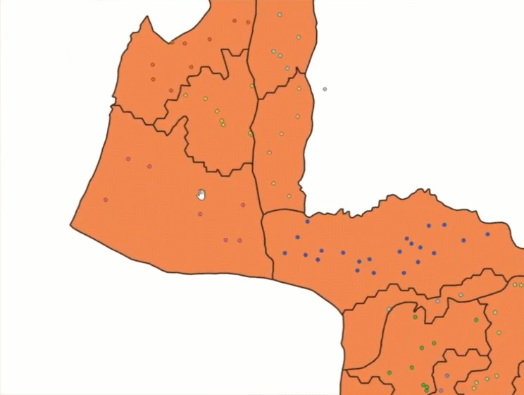 When we colored the community points by their facility assignments, it revealed some interesting patterns. Seeing all the communities belonging to the same facility marked in the same color quickly showed us where things don't align with administrative boundaries.