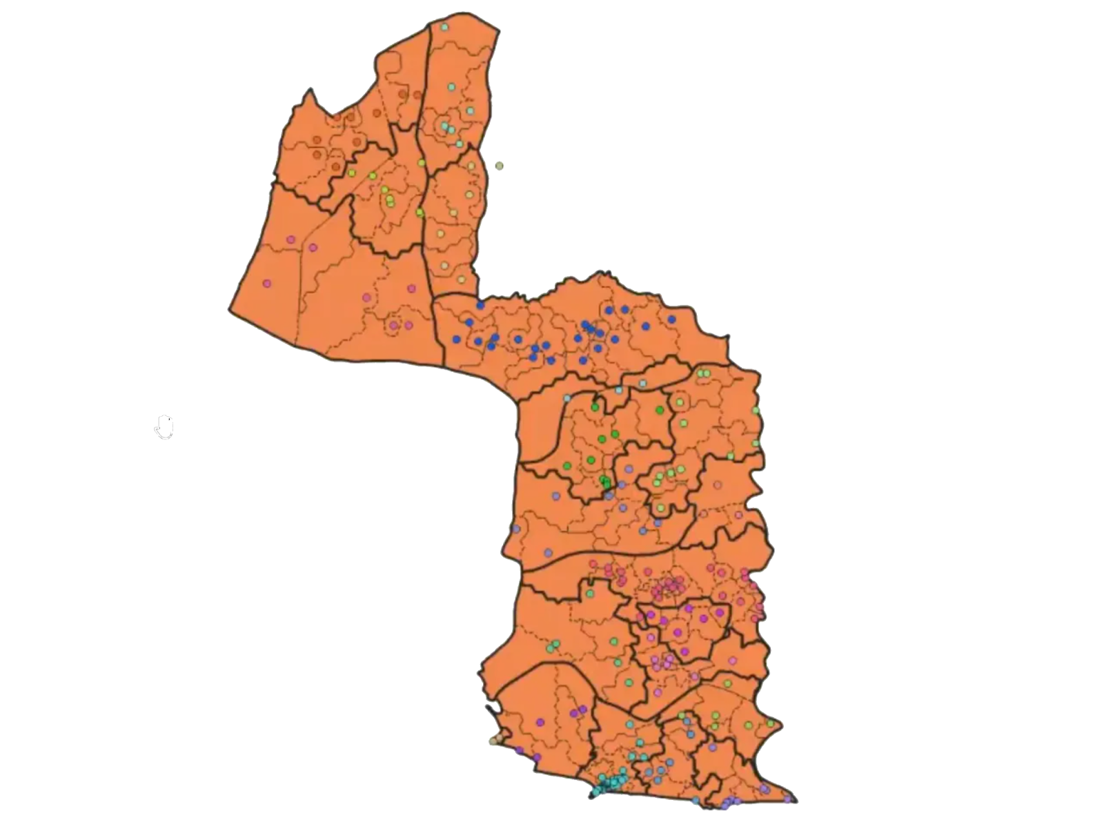 In several places, health facility catchments cross district boundaries. The program's lists show clean hierarchies: counties contain districts, districts contain health facilities. But mapping the actual communities revealed catchments that ignore district lines entirely. Communities of the same color (all belonging to one facility) spread across multiple districts.