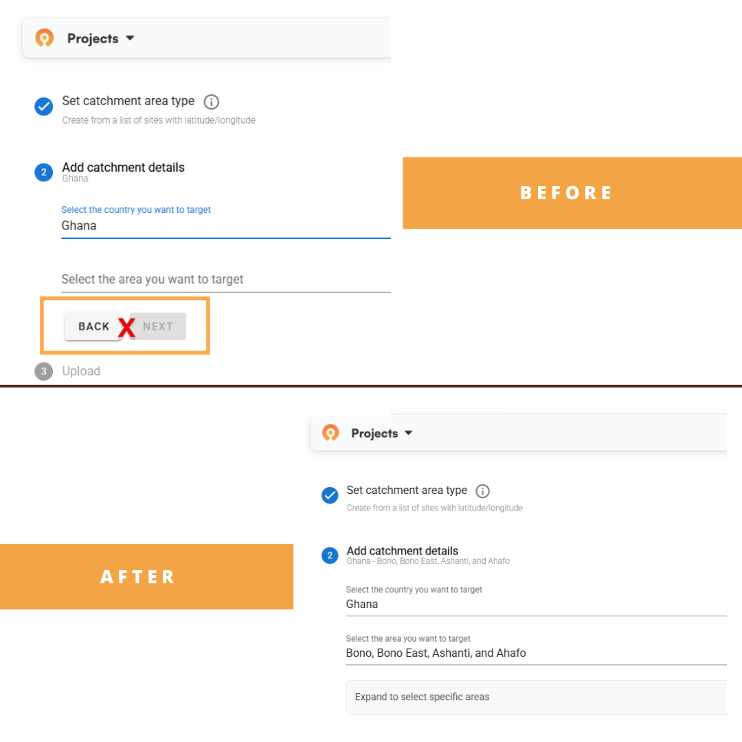 Hidden admin selector. The admin selector button doesn't appear until after you've selected the country and administrative area you want to work in. It used to show up earlier, which confused users who thought they needed to interact with it or take an action before moving on.