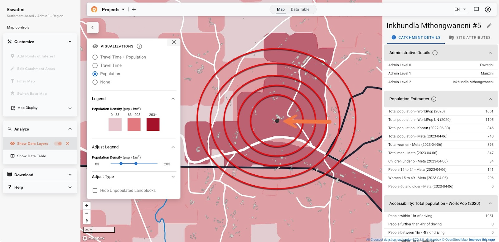 We'll keep expanding the settlement catchments available on HDX as new population data becomes available. For teams that need catchment data in countries we haven't covered yet, the Crosscut App can generate custom catchments for most locations.