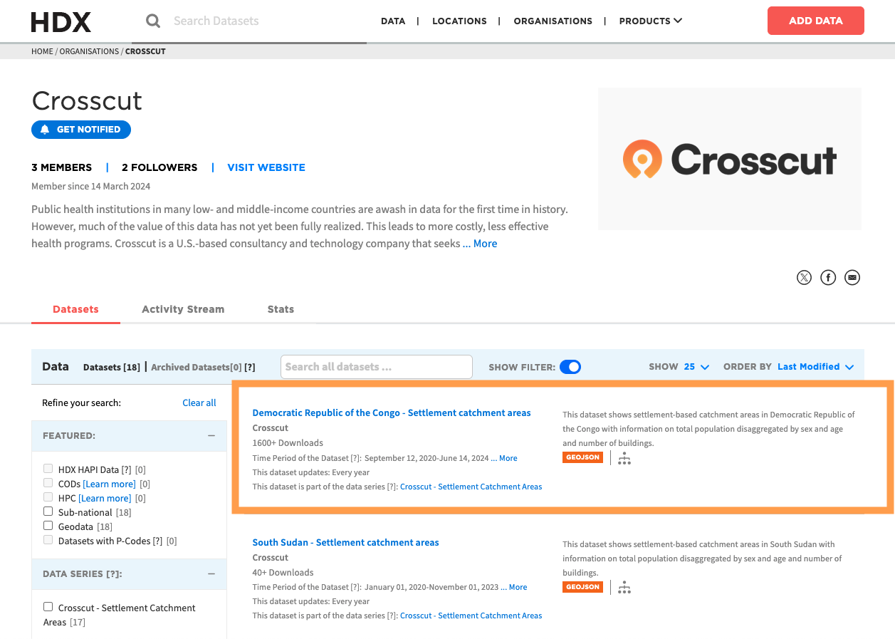 All Crosscut settlement catchment data is available through HDX under open licensing. No registration or attribution required – just download and use.