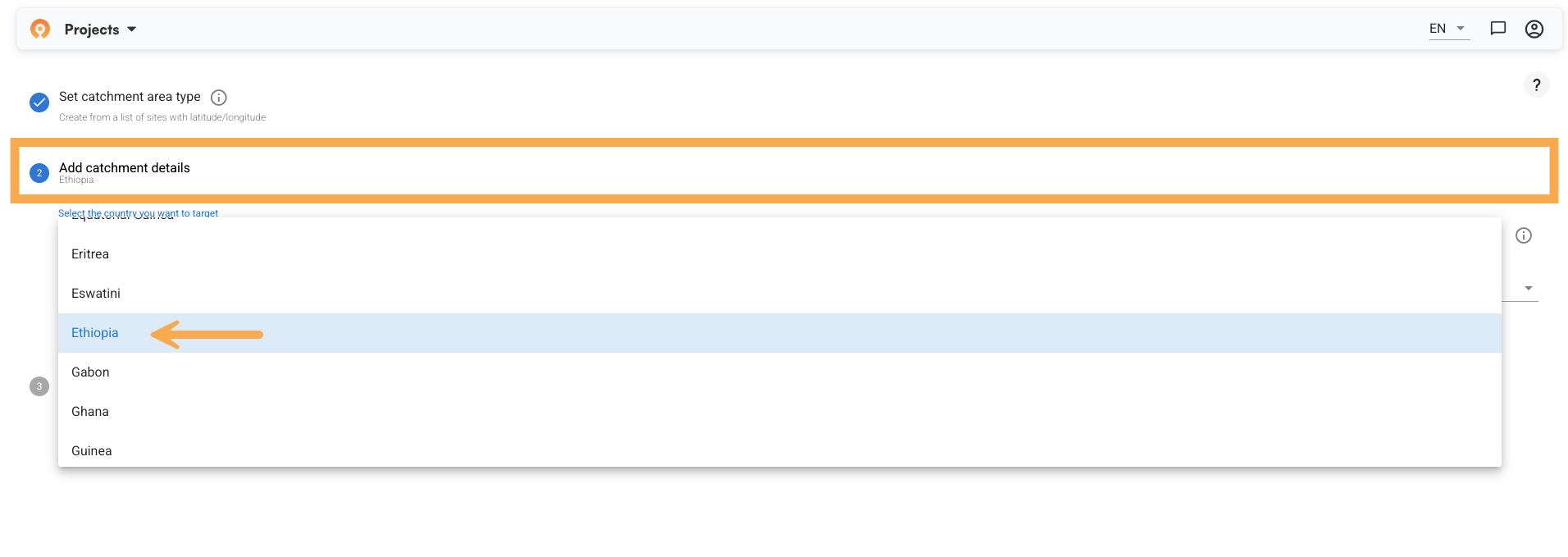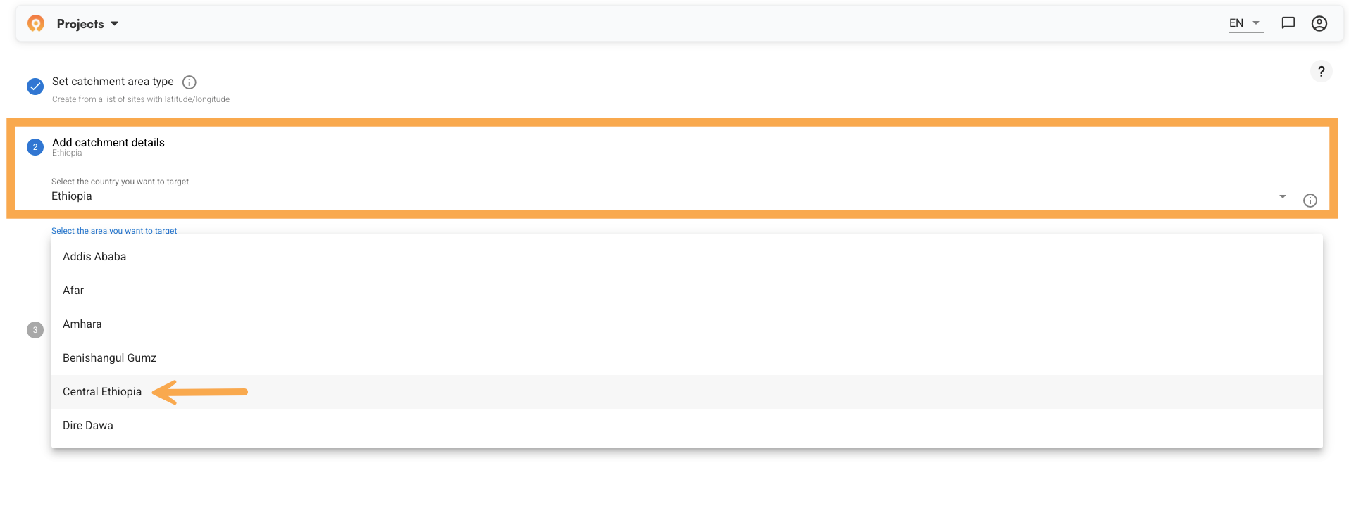 Next, select your country and the specific area you want to target. In this example, we are working with health facilities in Central Ethiopia.