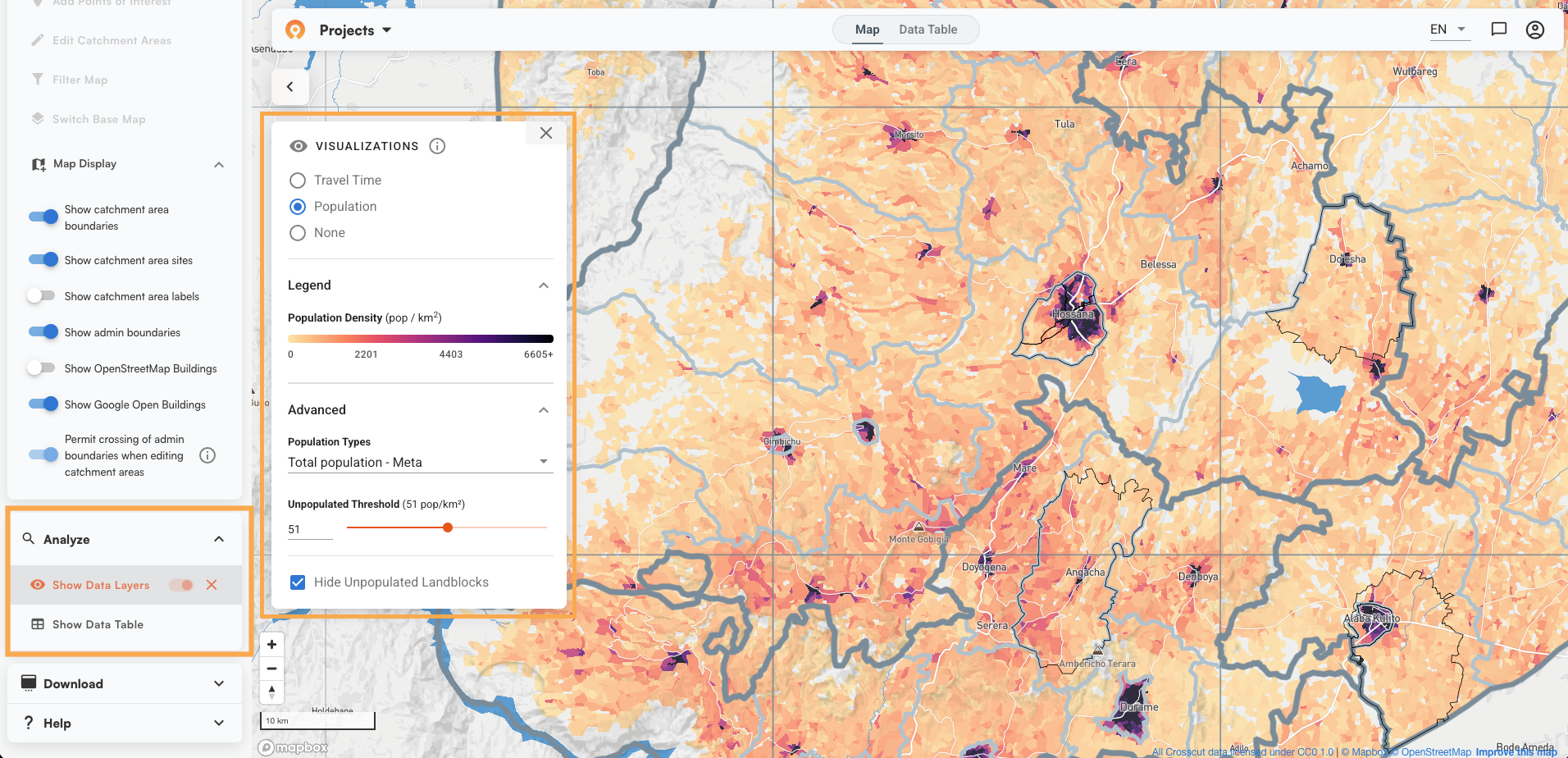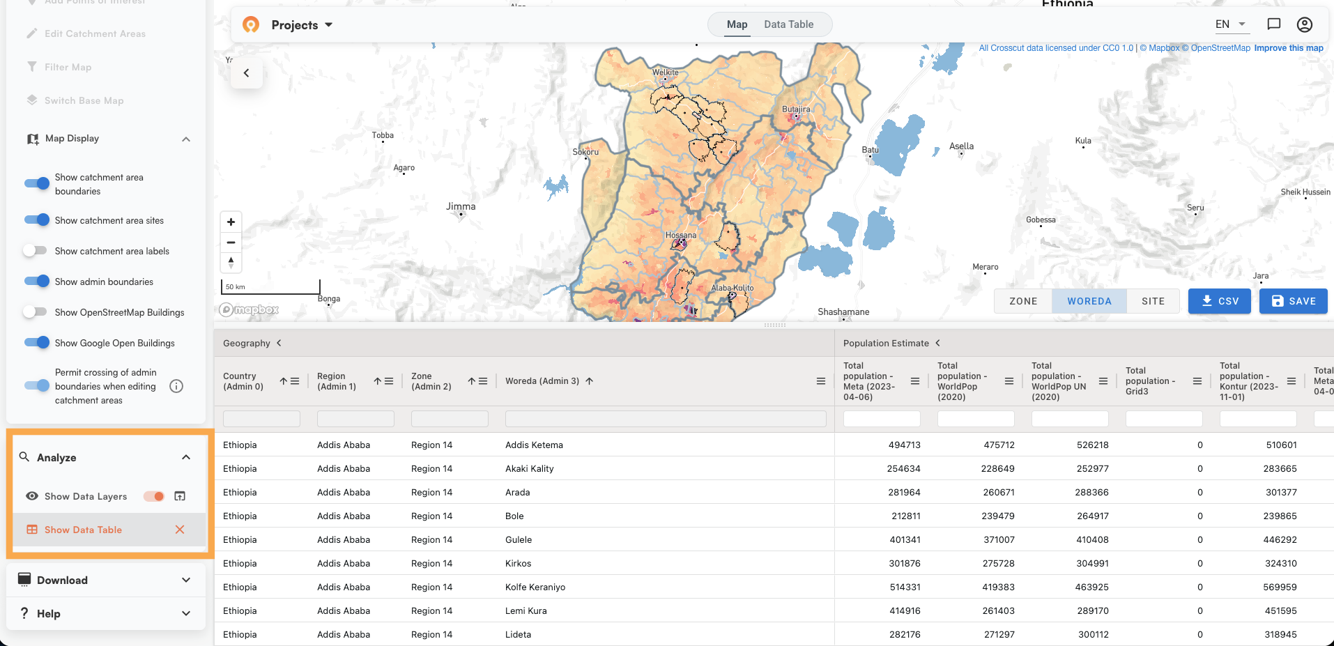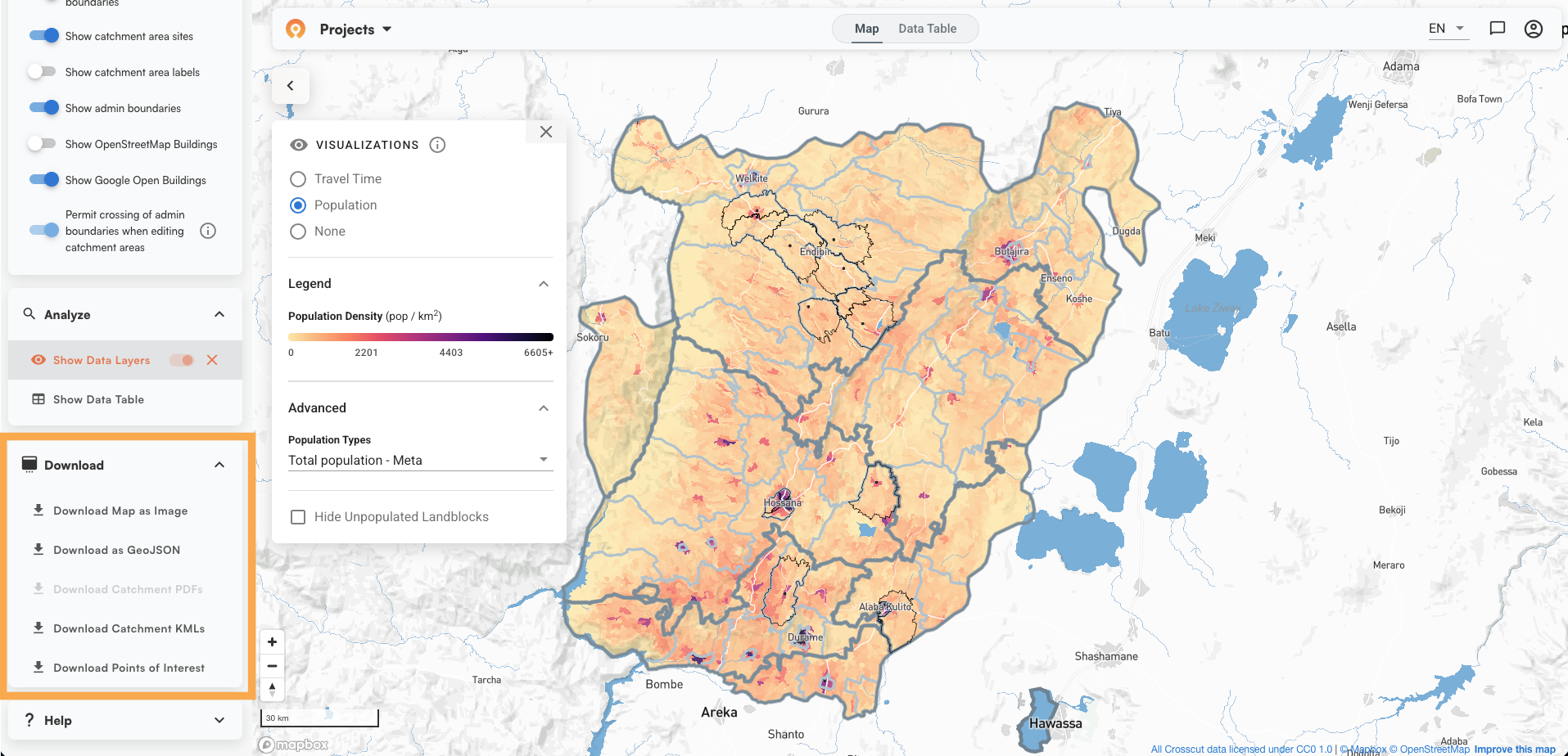 The Data Table (accessible from the top of the map view) lets you sort, filter, and view population and building data for all catchments before you export.