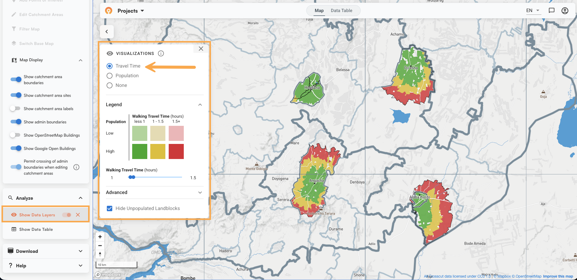 - Travel Time – Overlays both population density and walking travel time in a single view. Dark shading indicates high population. Color indicates travel time: green is under one hour, yellow is one to four hours, red is over four. This is the view most teams use to identify where mobile outreach is needed and where community health workers are stretched thin. The accessibility heat maps article goes deeper on how to use this layer.