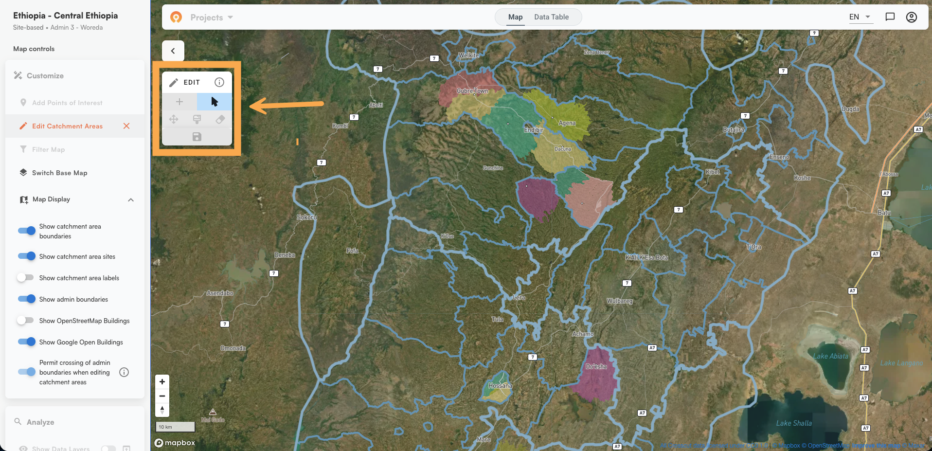 Click "Edit Catchment Areas" in the left panel to enter edit mode. The base map switches to satellite view so you can see terrain while you work. A small toolbar appears with four tools: