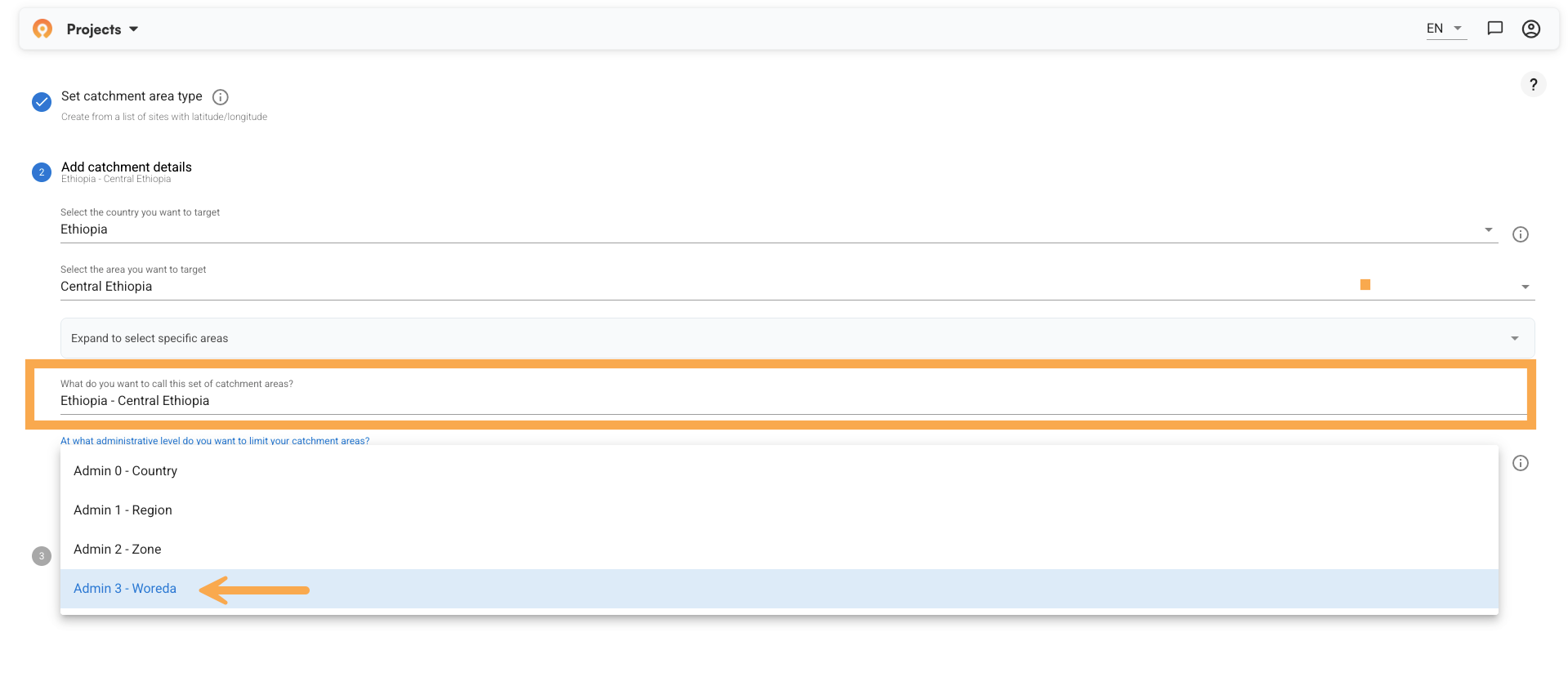 After selecting your region, the app asks what to call this set of catchment areas and at what administrative level to limit them.
