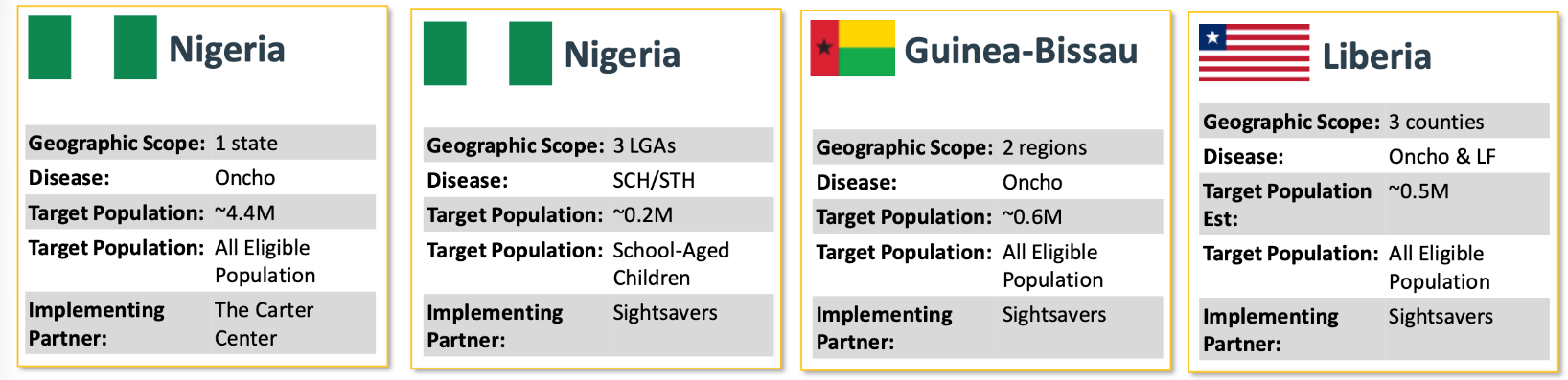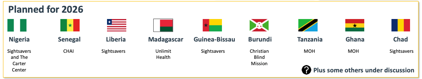 We're looking at nine country projects through 2026. The list includes Nigeria, Senegal, Liberia, Madagascar, Guinea-Bissau, Burundi, Tanzania, Ghana, and Chad, with others still under discussion. Most are running through implementing partners including Sightsavers, The Carter Center, CHAI, Unlimit Health, and Christian Blind Mission. These organizations help coordinate NTD campaign delivery on the ground alongside MOH in most countries.